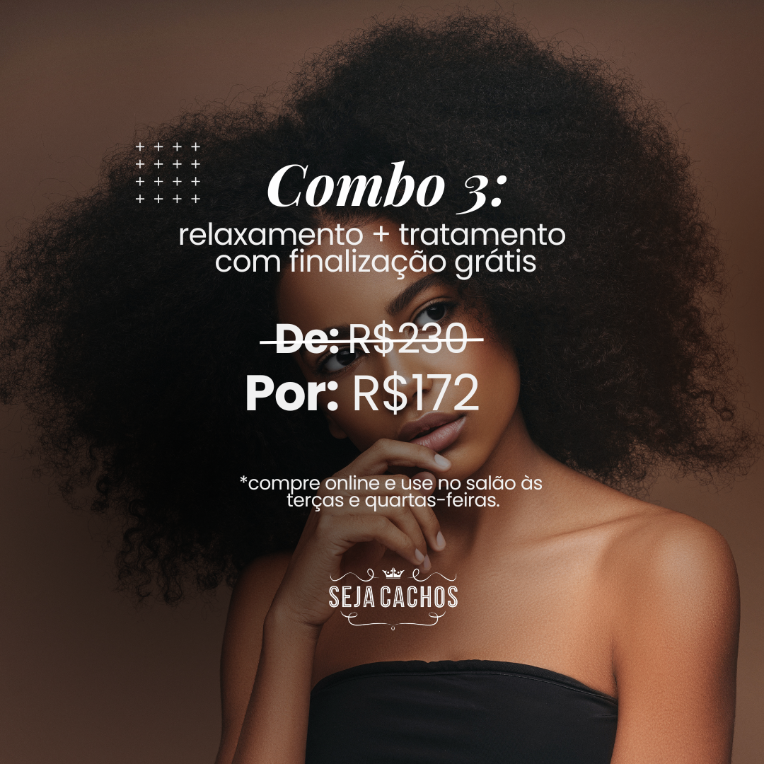 Chega de frustração com profissionais que não entendem seu cabelo! Relaxamento e Tratamento feitos por especialistas em cabelos crespos e cacheados. Garanta seu combo nas terças e quartas com 25% de desconto e finalização grátis.